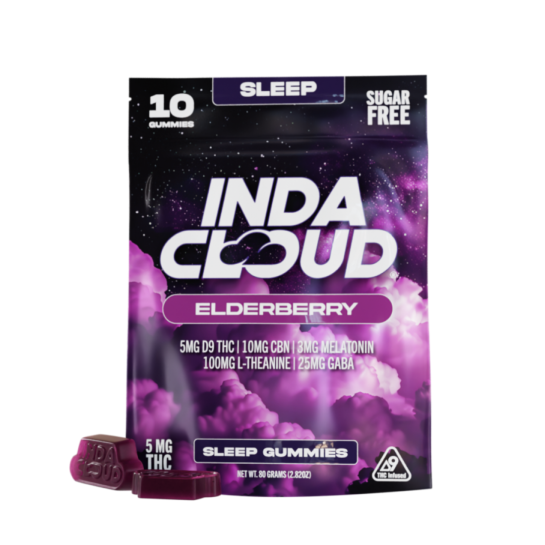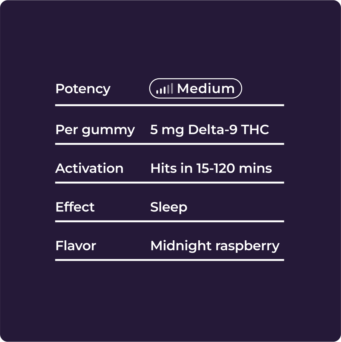 • Each gummy contains 5 mg THC, 10 mg CBN, 3 mg Melatonin, 25 mg GABA, 100 mg L-Theanine (10 x 5mg gummies)