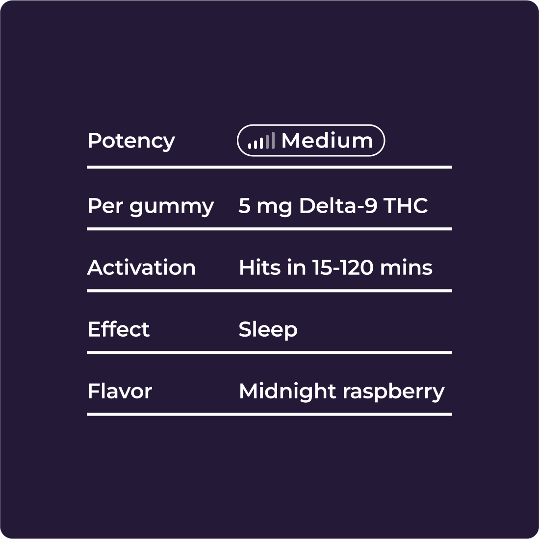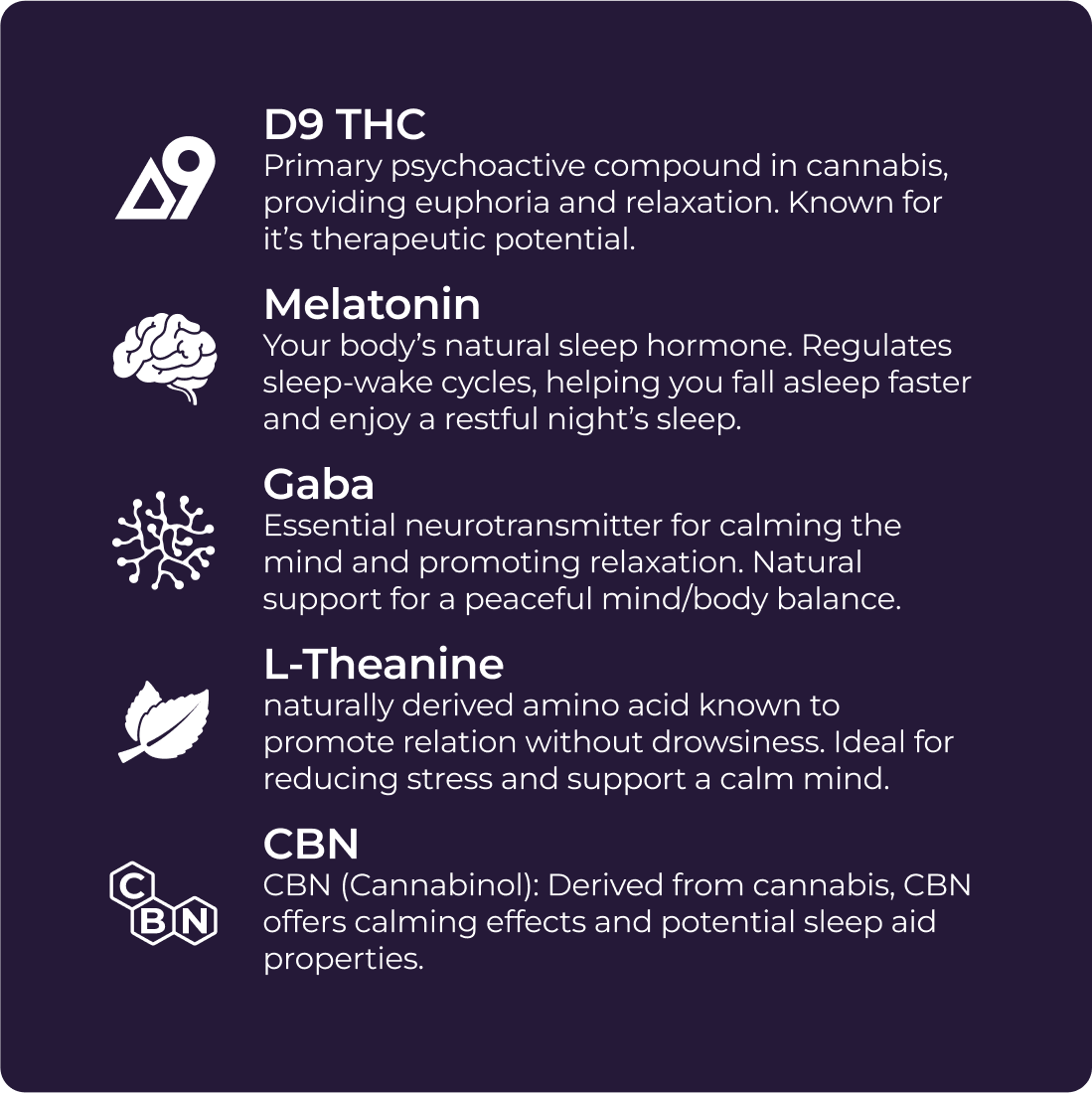 • Each gummy contains 5 mg THC, 10 mg CBN, 3 mg Melatonin, 25 mg GABA, 100 mg L-Theanine (40 x 5mg gummies)